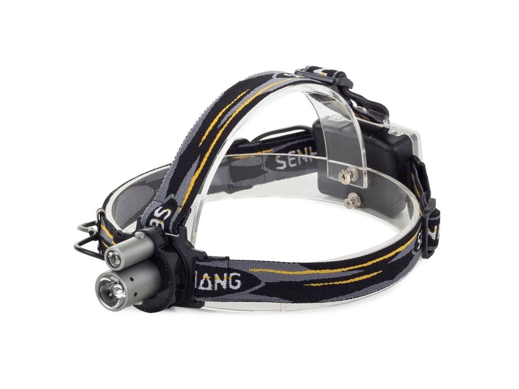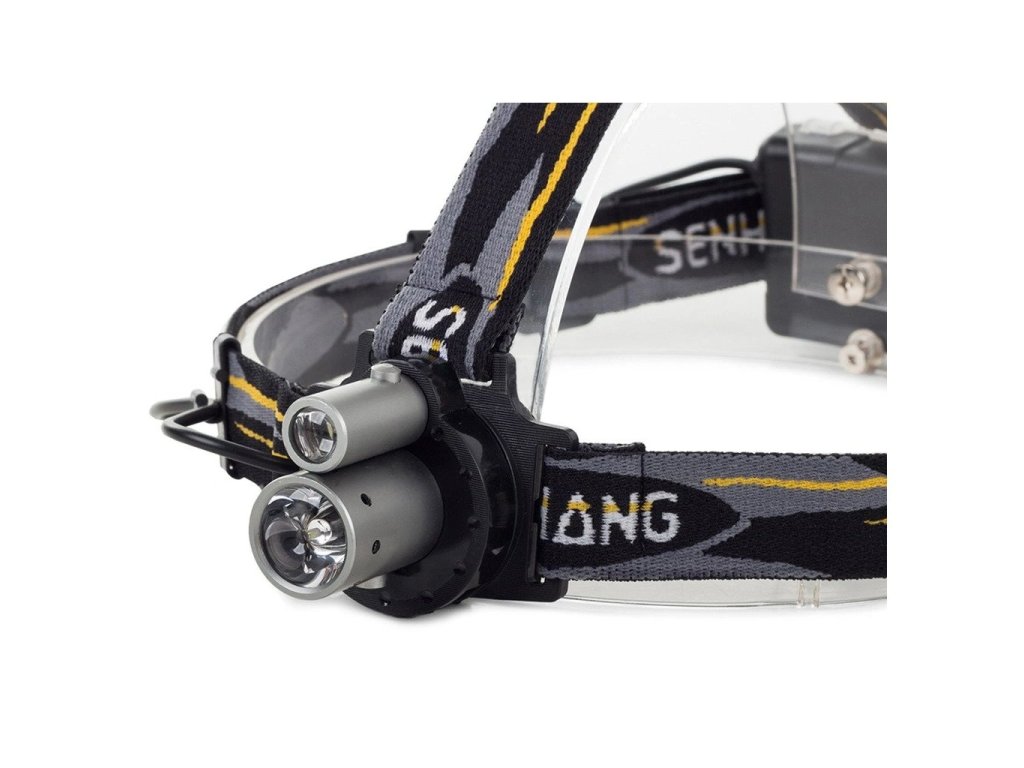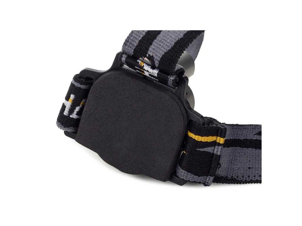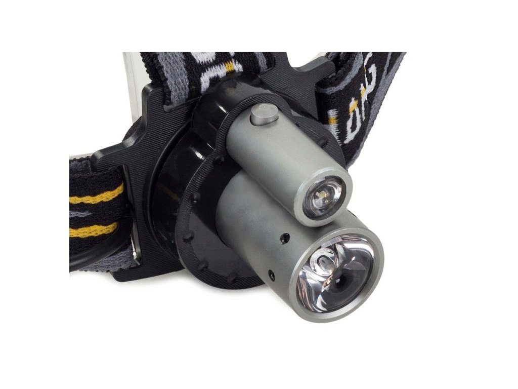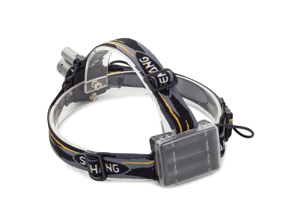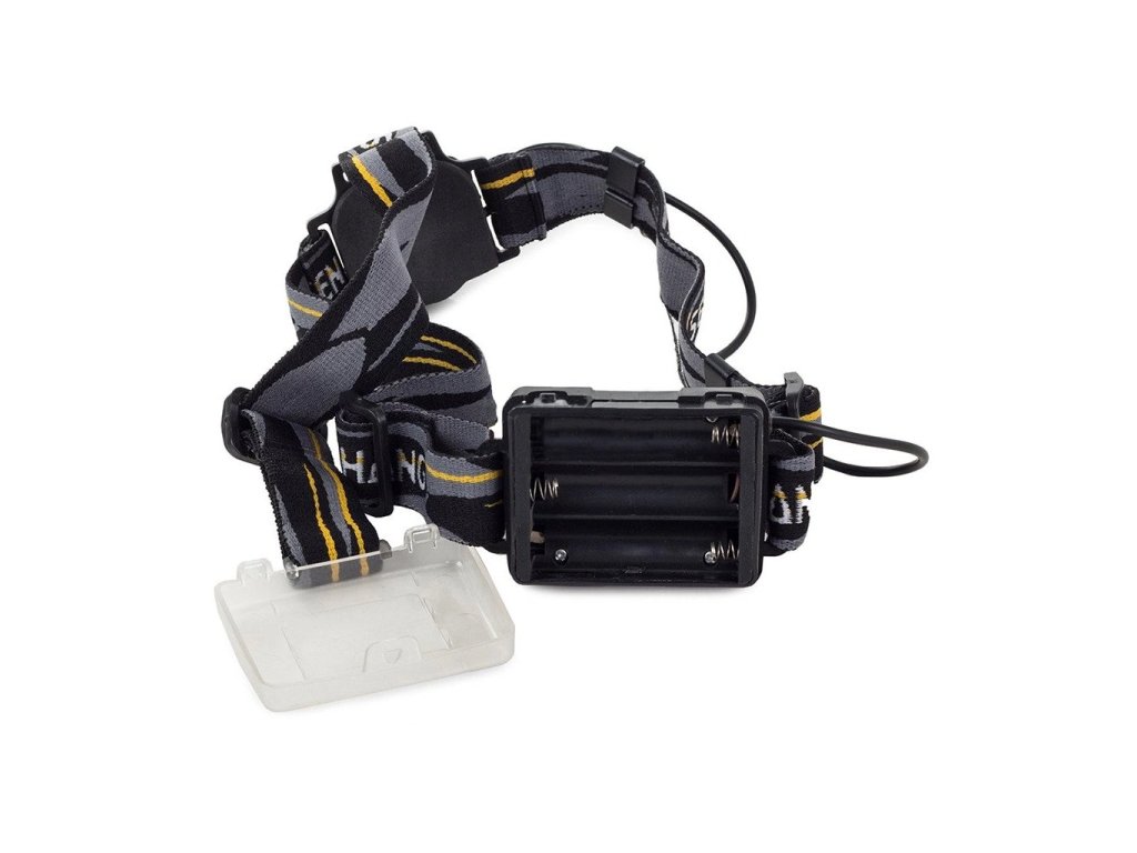 Má také nastavitelný úhel náklonu nahoru/dolů. Lehké a praktické. Jeho konstrukce zajišťuje stabilitu a zabraňuje sklouznutí svítilny z hlavy. Má také 2 elastické a nastavitelné popruhy. Koš na baterie umístěný na zadní straně hlavy znamená, že baterka má lepší rozložení hmotnosti nesklouzne z hlavy.