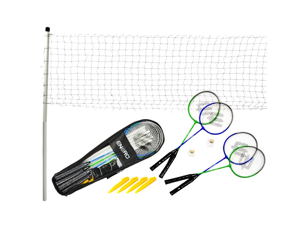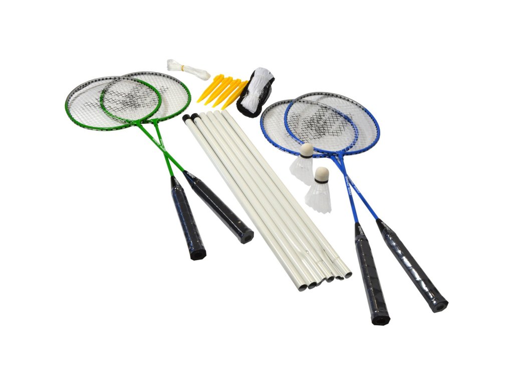 Badmintonový set ideální pro rekreační hru v hale i venku. Využijete ho s rodinou a přáteli na zahradě, na pláži i na sportovišti. Vzhledem k nižší rychlosti po dopadu je vybavení jako stvořené pro děti. V setu: 4 rakety, 2 nylonové míčky, kompletní stojan se sítí a šňůrami, taška s možností nošení přes rameno.