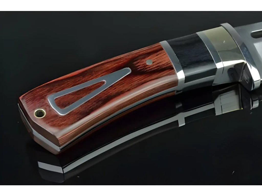 Ergonomická ocelová rukojeť s dřevěnou podšívkou a dekoracemi.