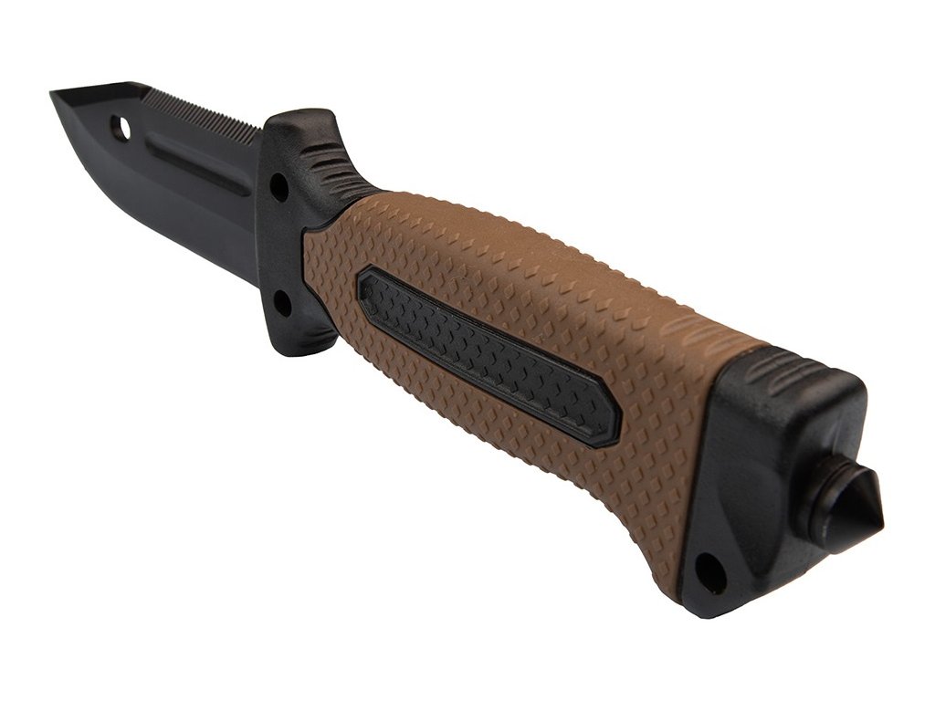 Černý vojenský nůž je na hřbetu opatřen vroubkováním, které funguje jako univerzální pilka.