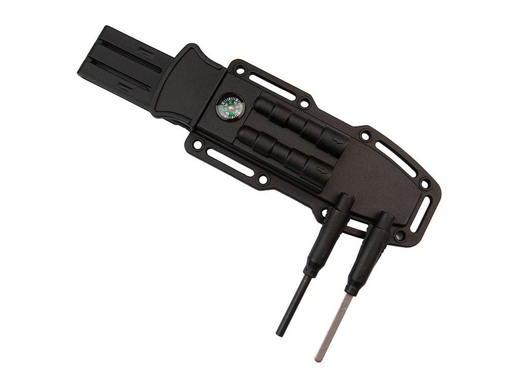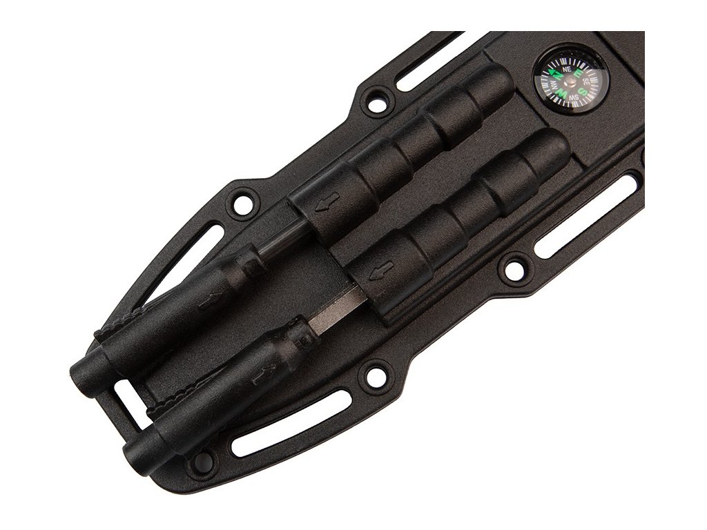 Multifunkční odolné pouzdro obsahuje zapalovač s poplašnou píšťalkou a malou brousku, která vám umožní snadno nabrousit nůž za jakýchkoliv okolností.