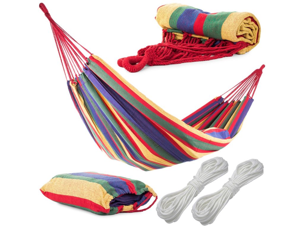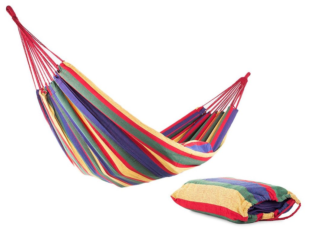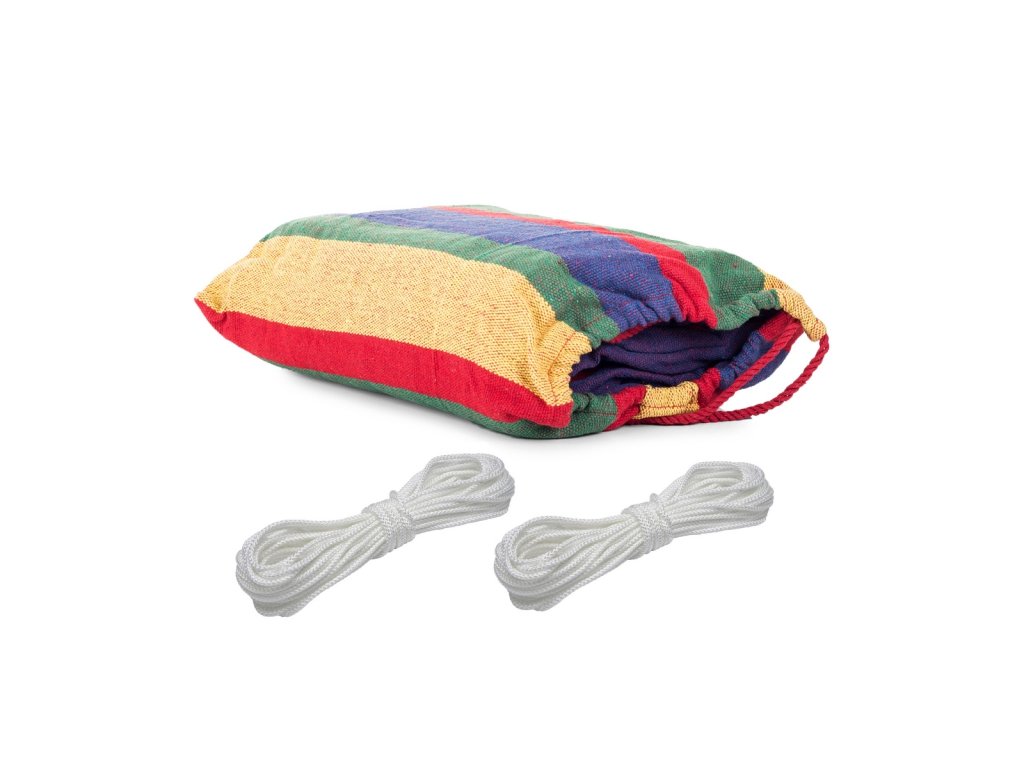 Závěsná pletená houpací síť, ideální pro pověšení na verandu Vaší chaty nebo jen tak do přírody mezi stromy při kempování. Bavlněná dvojitě pletená vlákna zajišťují dostatečnou pevnost před přetrhnutím vláken. Hlavní barvou je červená, ostatní pruhy jsou žluté, fialové, zelené, viz obrázek.