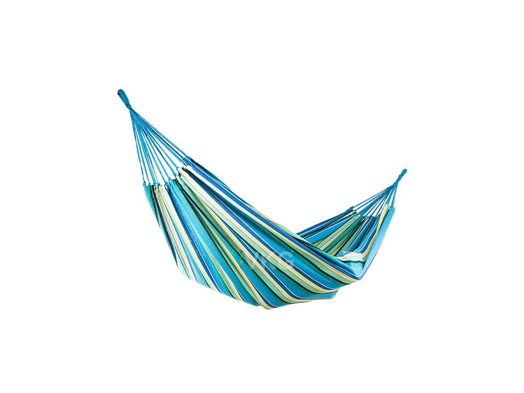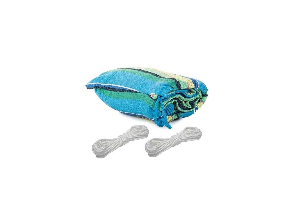 Závěsná pletená houpací síť, ideální pro pověšení na verandu Vaší chaty nebo jen tak do přírody mezi stromy při kempování. Bavlněná dvojitě pletená vlákna zajišťují dostatečnou pevnost před přetrhnutím vláken. Hlavní barvou je modrá, ostatní pruhy jsou zelené, azurové, viz obrázek.