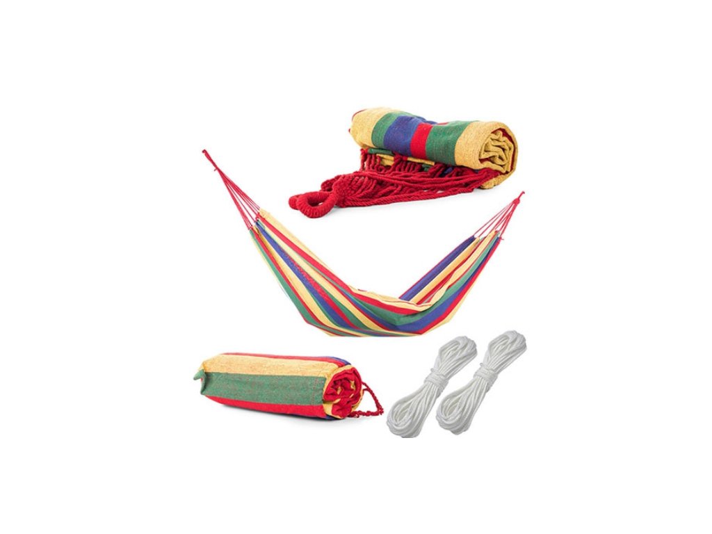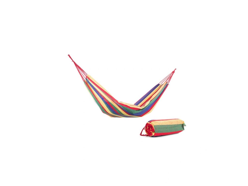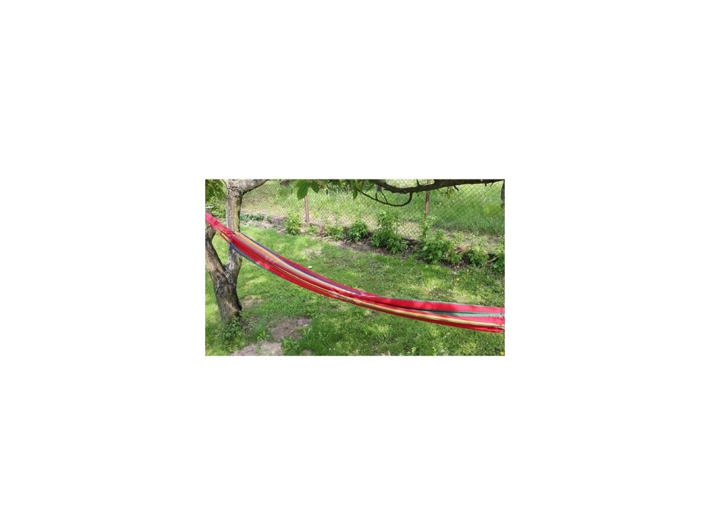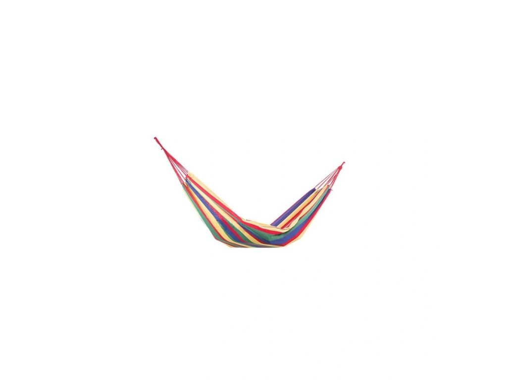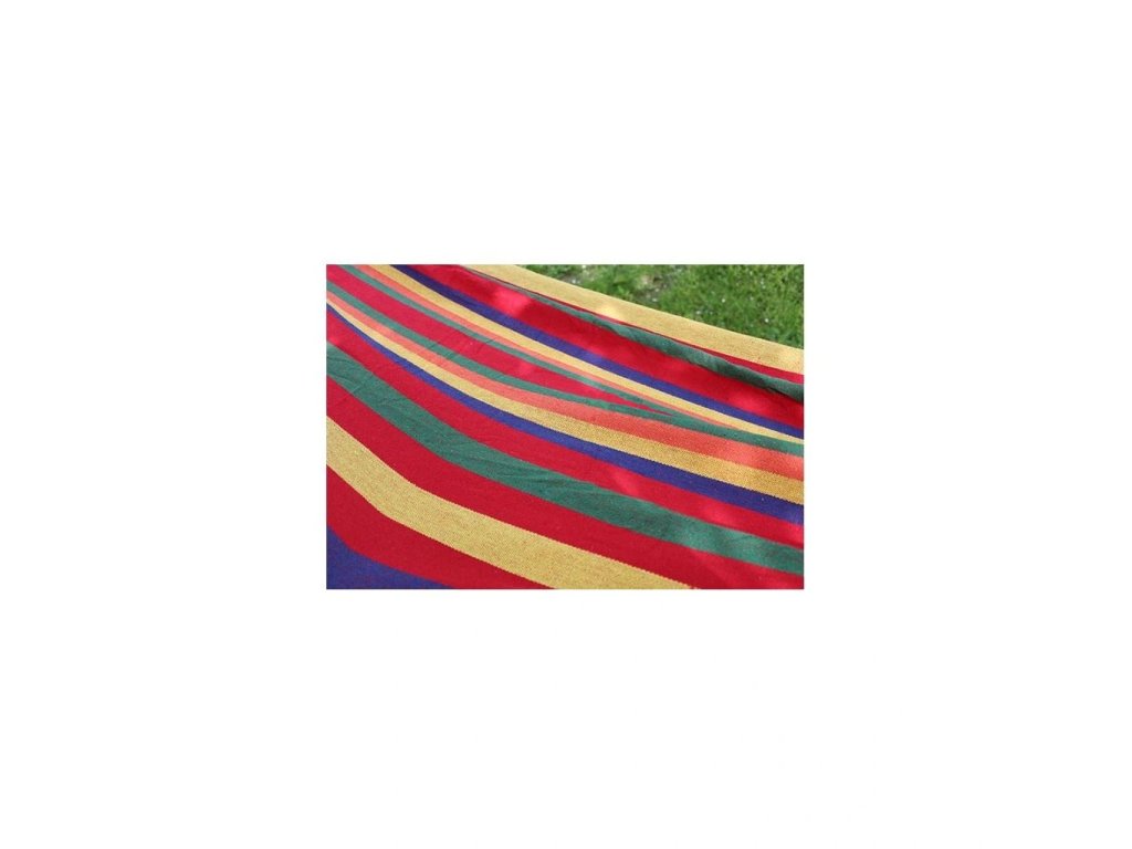 Závěsná pletená houpací síť, ideální pro pověšení na verandu Vaší chaty nebo jen tak do přírody mezi stromy při kempování. Bavlněná vlákna zajišťují dostatečnou pevnost před přetrhnutím vláken. Možnost složit do praktického vaku. Hlavní barvou je červená, ostatní pruhy jsou žluté, fialové, zelené, viz obrázek.