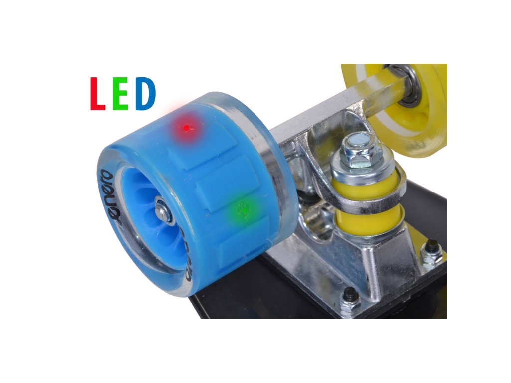 Tento pennyboard má zaručeně atraktivní a moderní nový design. Deska vyrobená z plastu zajišťuje vysokou odolnost skateboardu ve srovnání s tradičními modely vyrobenými z lepených dřevěných desek. Protiskluzový horní povrch zajišťuje abyste jste při jízdě neztratili trakci a stabilitu. Silná kola jezdí hladce po povrchu a jejich materiál je odolný proti poškození a oděru, díky čemuž zařízení vydrží déle. Malá velikost usnadňuje skladování a přepravu skateboardu, ať jste kdekoli. Další výhodou jsou LED kola, která zvyšují viditelnost a zároveň bezpečnost.