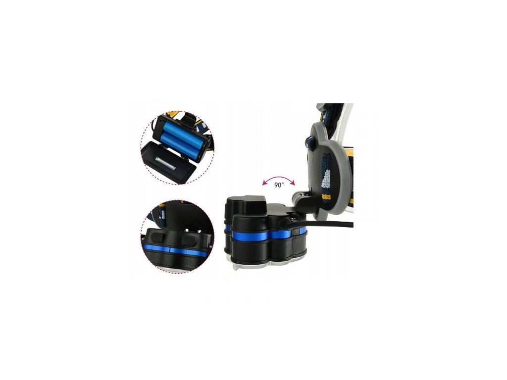 Má také nastavitelný úhel náklonu nahoru/dolů. Lehké a praktické. Jeho konstrukce zajišťuje stabilitu a zabraňuje sklouznutí svítilny z hlavy. Má také 2 elastické a nastavitelné popruhy. Koš na baterie umístěný na zadní straně hlavy znamená, že baterka má lepší rozložení hmotnosti nesklouzne z hlavy.