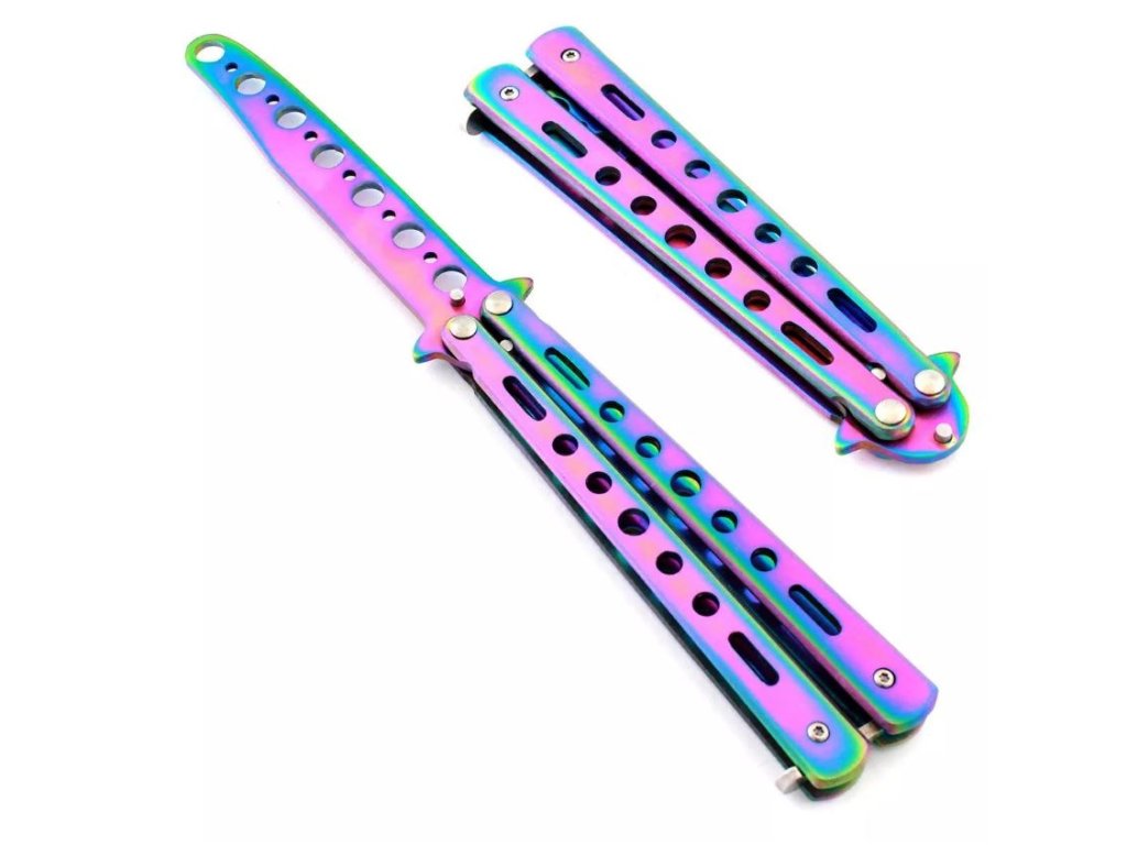 Zavírací tréninkový nůž - motýlek, duhový. Má tupou čepel, která zajišťuje úplnou bezpečnost pro uživatele. Ideální pro trénink. Snadné rozložení jednou rukou. Nůž je vybaven zámkem otevírání a zavírání.